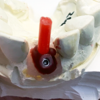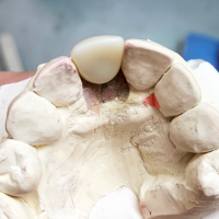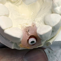 This is an example of an implant case that was placed with an extreme angle. To correct for this, we used a UCLA gold to plastic cast in yellow gold. Our ceramists added pink tissue to mimic the recession at the gingiva on this cement-retained zirconia crown.